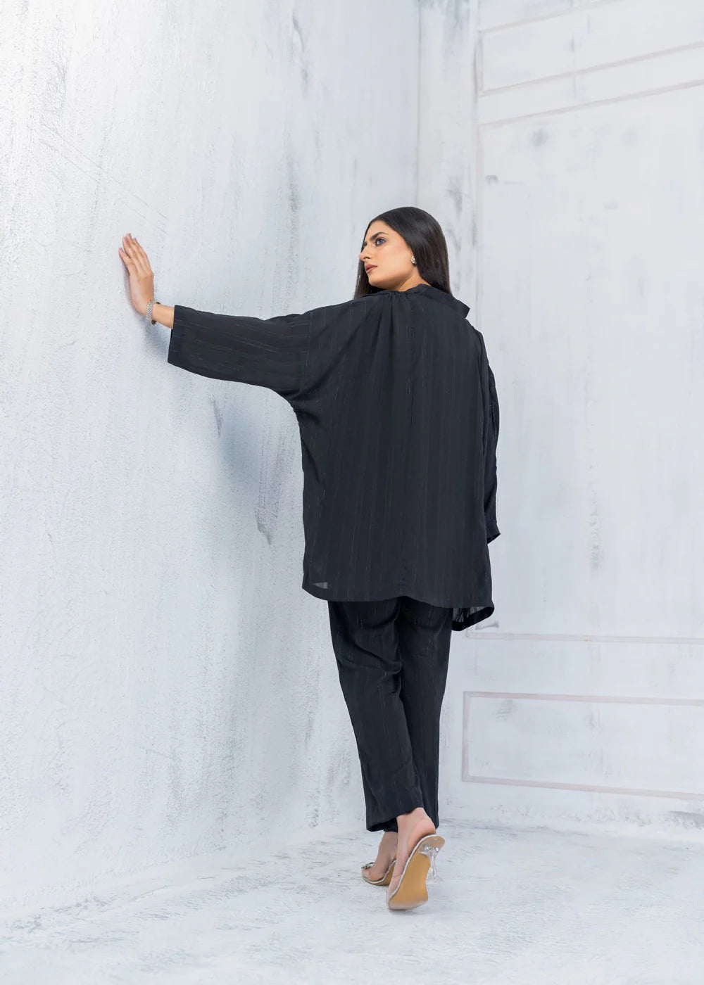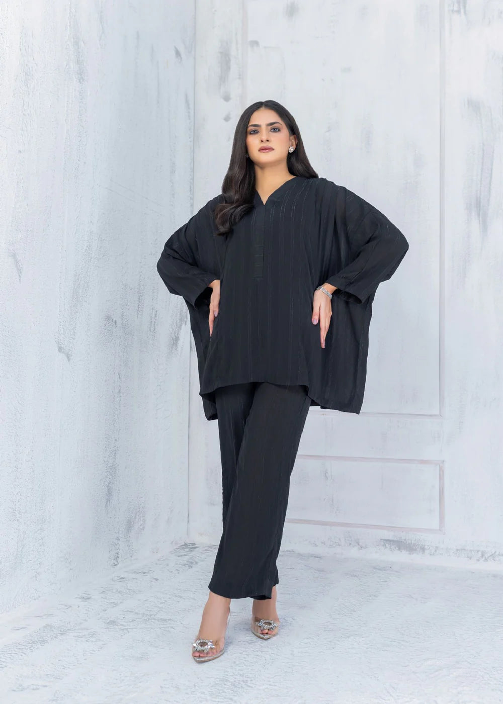 This beautiful luxury Co-Ord set in black color, piece blends elegance, sophistication and high end fashion. Cut from self lining georgette and butterfly sleeves. Paired with straight trouser..