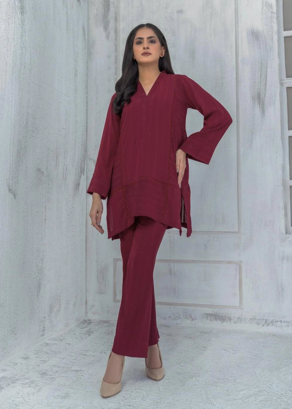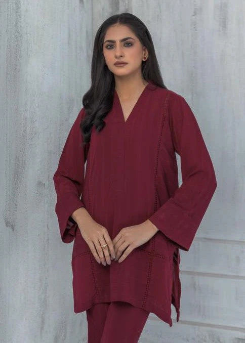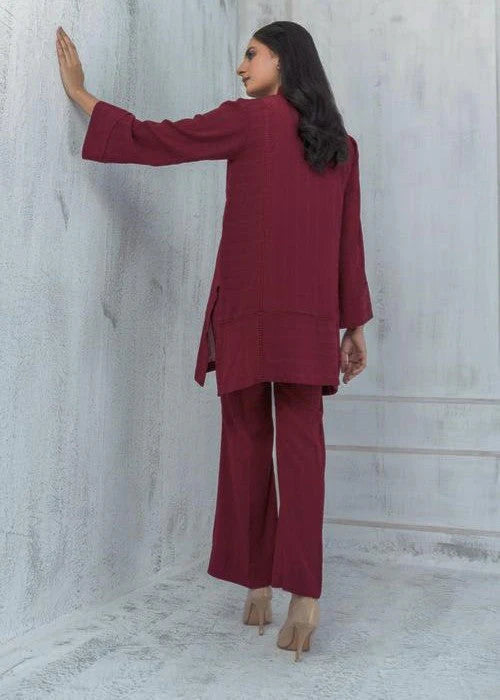 Co-Ord set on georgette self lining fabric in deep scarlet featuring lace detailing on shirt. The hem of the sleeves are adorned with fabric and lace manipulation details. The top is paired with straight trouser for a sleeker look.