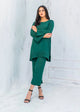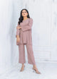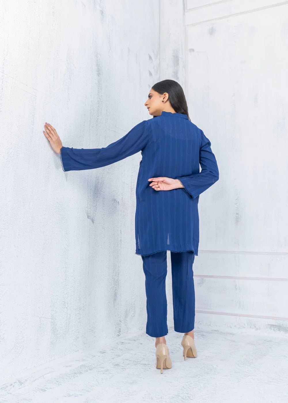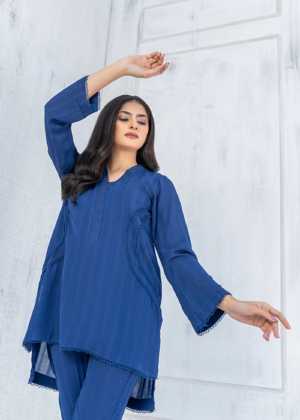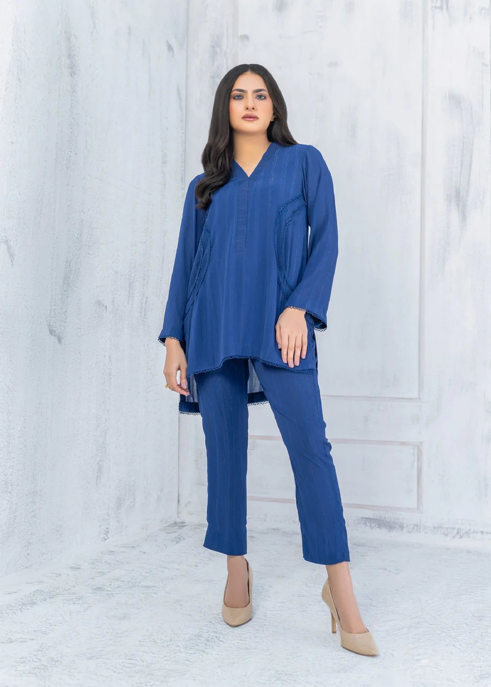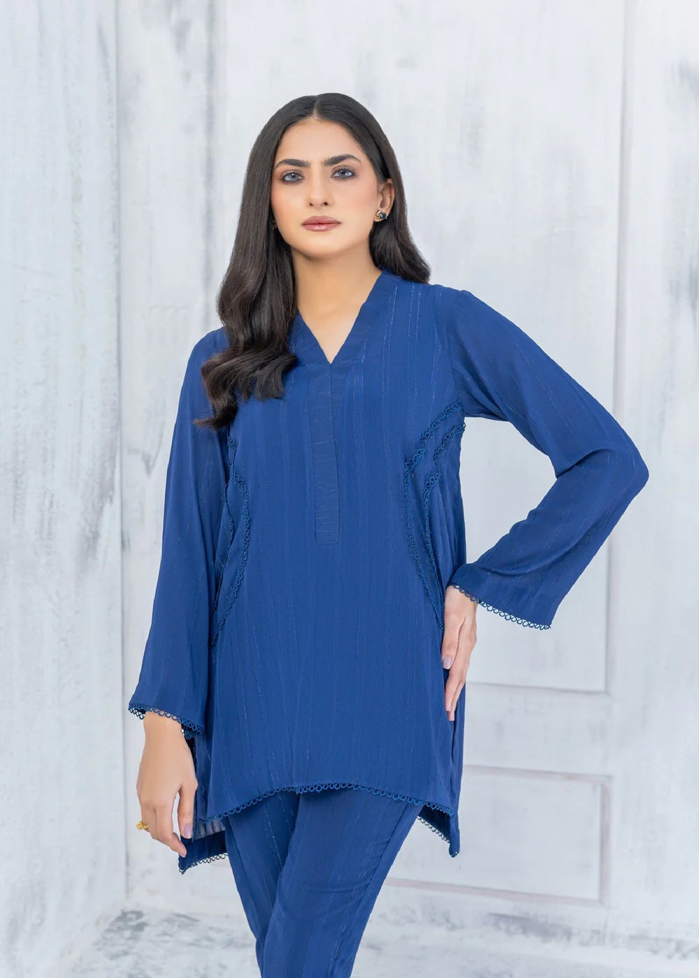 High-low co-ord set on georgette in mid night blue featuring lace on front shirt. The hem of the sleeves are adorned with fabric manipulation details. The top is paired with straight trouser for a sleeker look.