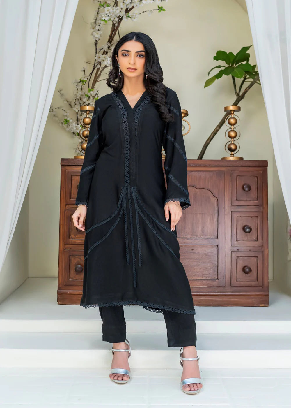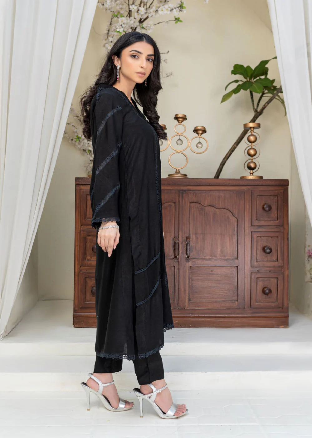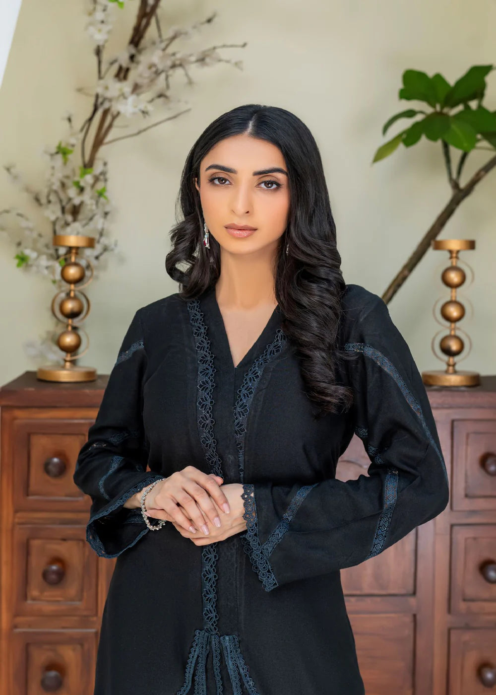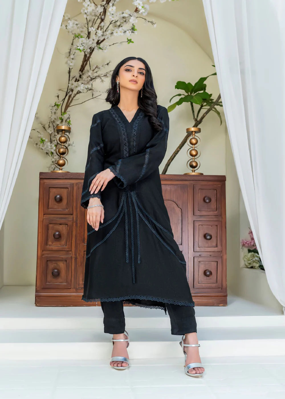 Long silhouette shirt on cotton net canvas in subtle black shade featuring panel on hemline adorned with pleats and lace details. The neckline is enhanced with mirror lace and fabric manipulation details and is set to perfection with light catching crystals. The shirt is paired with matching cotton net pants.