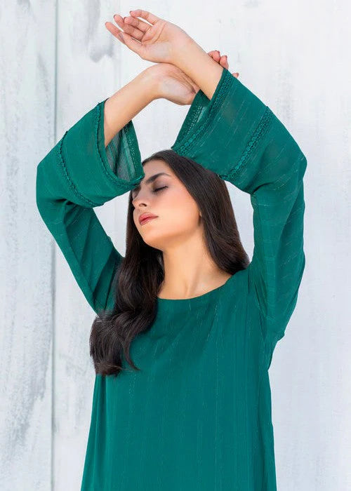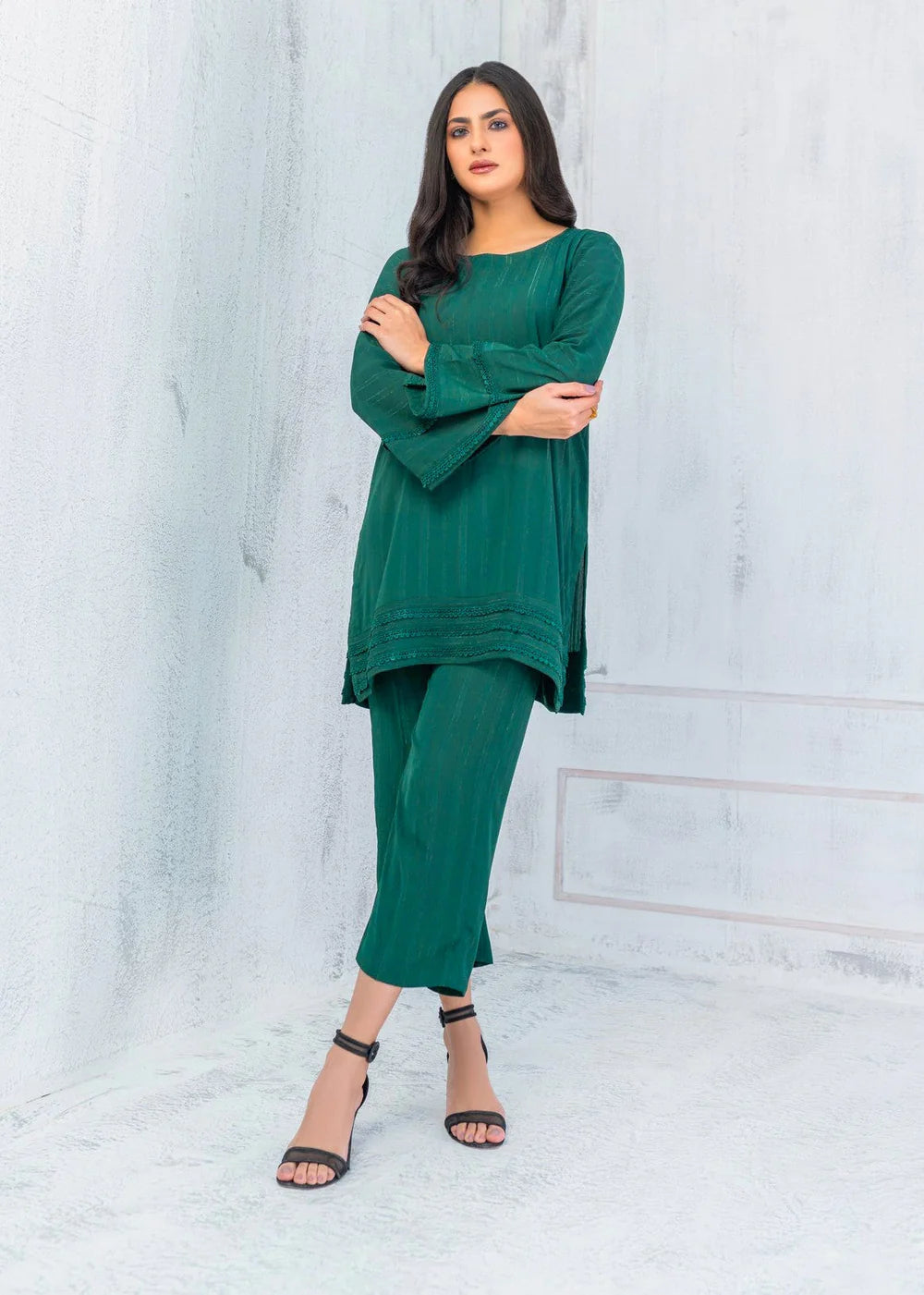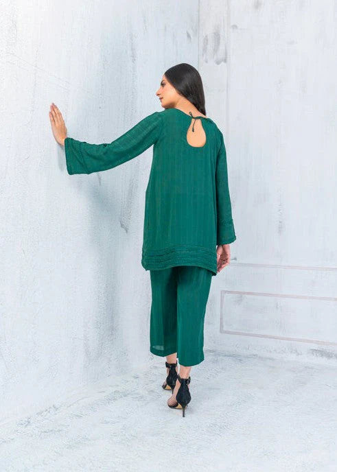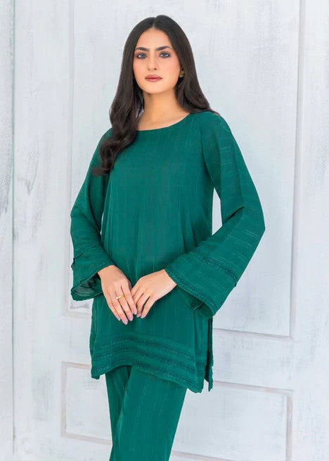 Co-Ord set on georgette self lining fabric in emerald green featuring lace detailing on shirt. The hem of the sleeves are adorned with fabric and lace manipulation details. The top is paired with straight trouser for a sleeker look.