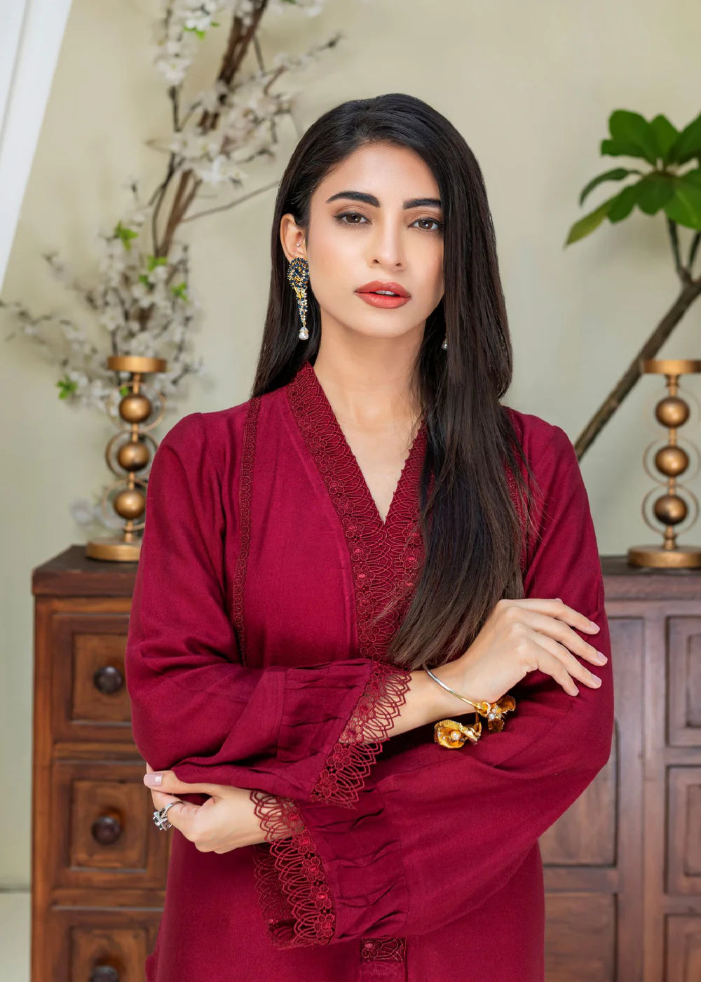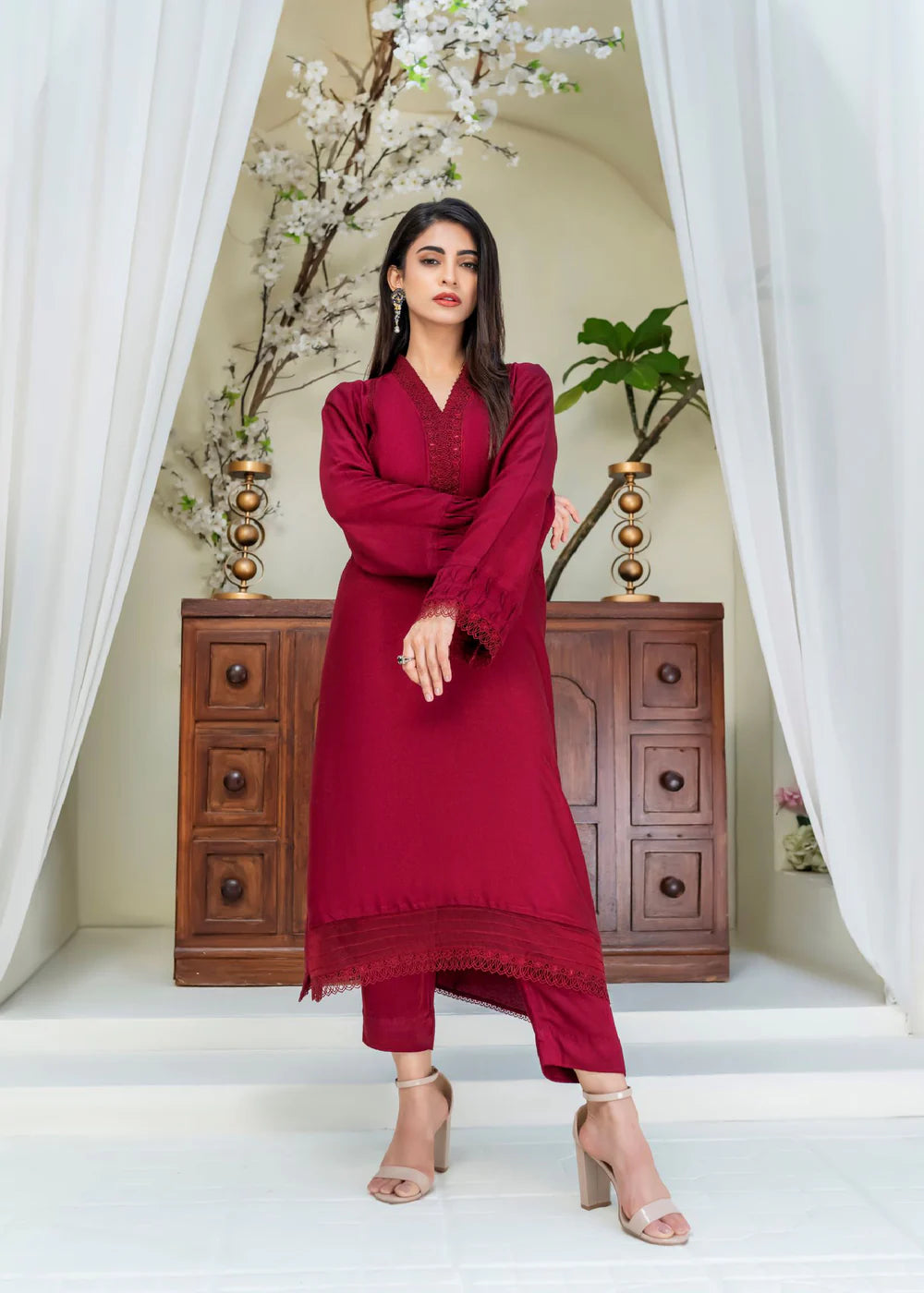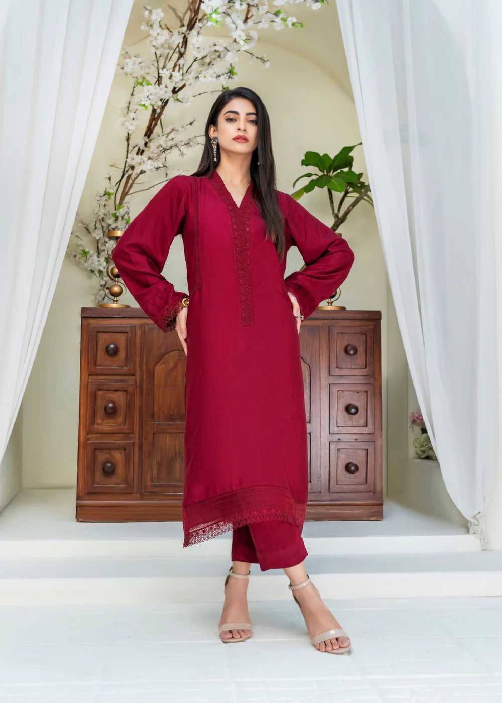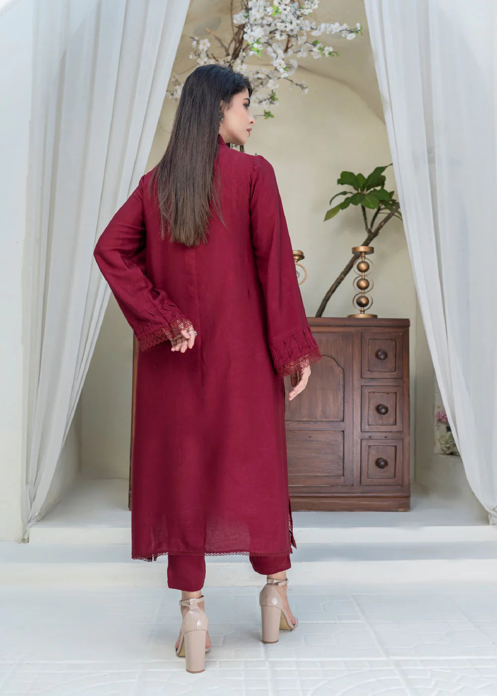 Long silhouette shirt on cotton net canvas in Mahroon shade featuring organza panel on hemline adorned with pleats and lace details. The neckline is enhanced with fabric manipulation details and is set to perfection with light catching crystals. The shirt is paired paired with matching cotton net pants.