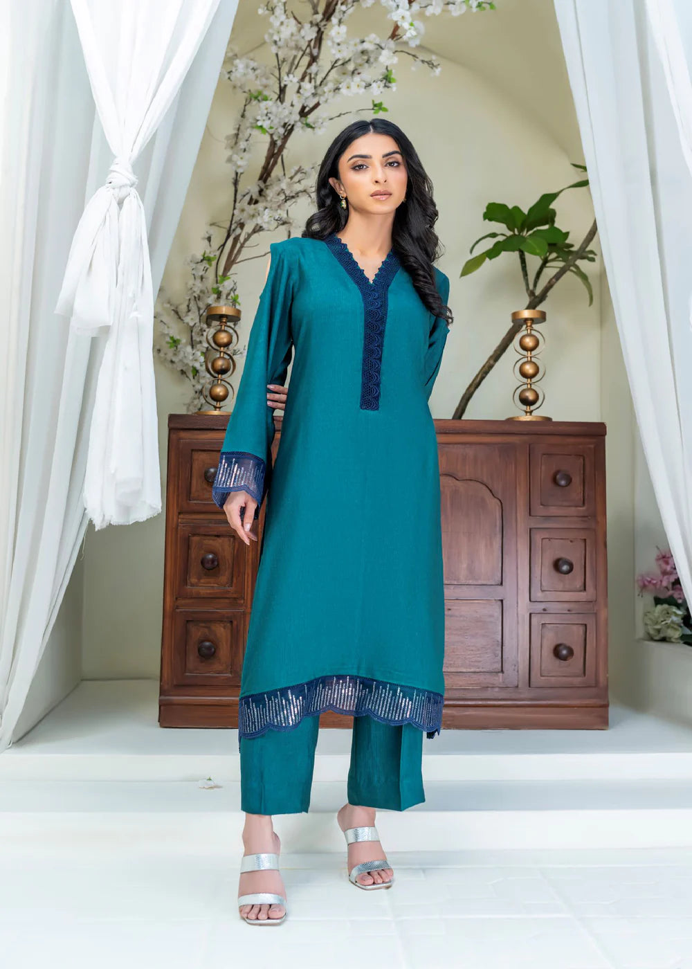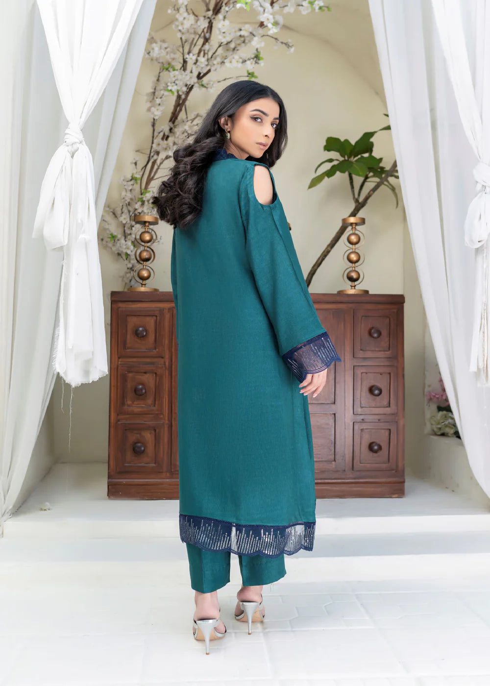 Long silhouette shirt on cotton net canvas in subtle emerald green shade featuring sequence panel on hemline adorned with lace details. The neckline is enhanced with laces and fabric manipulation details and is set to perfection with light catching crystals. The shirt is paired with matching cotton net pants.