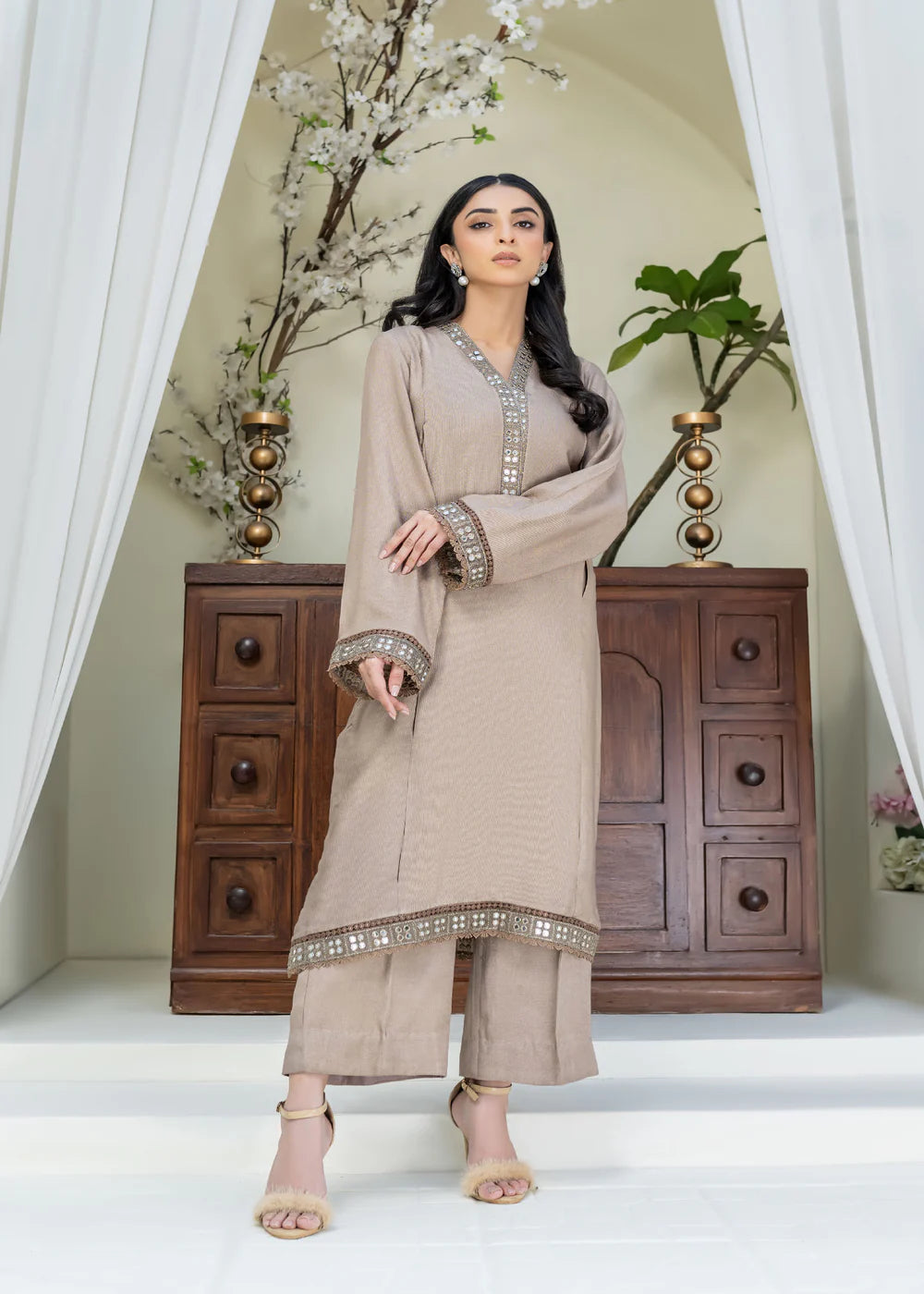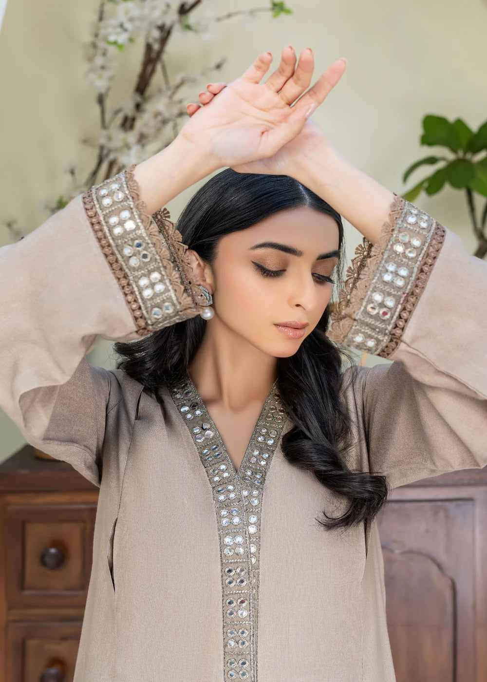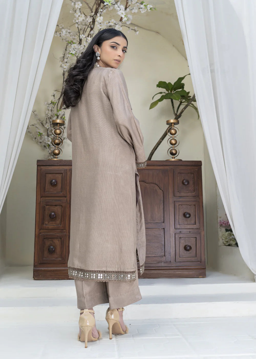 Long silhouette shirt on cotton net canvas in subtle brown shade featuring mirror lace on hemline adorned with pleats and lace details. The neckline is enhanced with mirror lace and fabric manipulation details and is set to perfection with light catching crystals. The shirt is paired with matching cotton net pants.